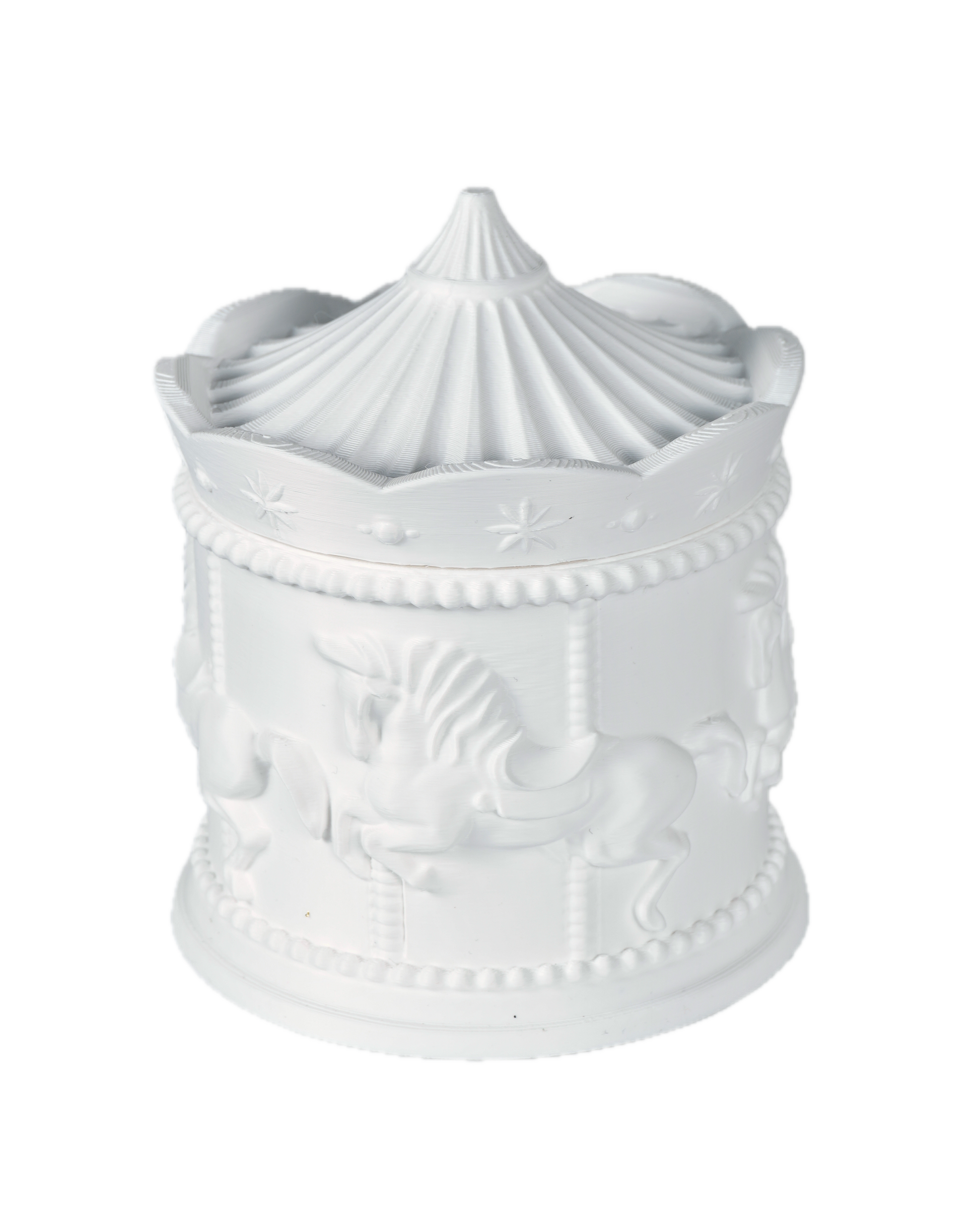 La forma del carosello con i cavalli ricorda le atmosfere delle feste e delle giostre di una volta, trasformando un oggetto funzionale in un dettaglio capace di evocare emozioni e ricordi.