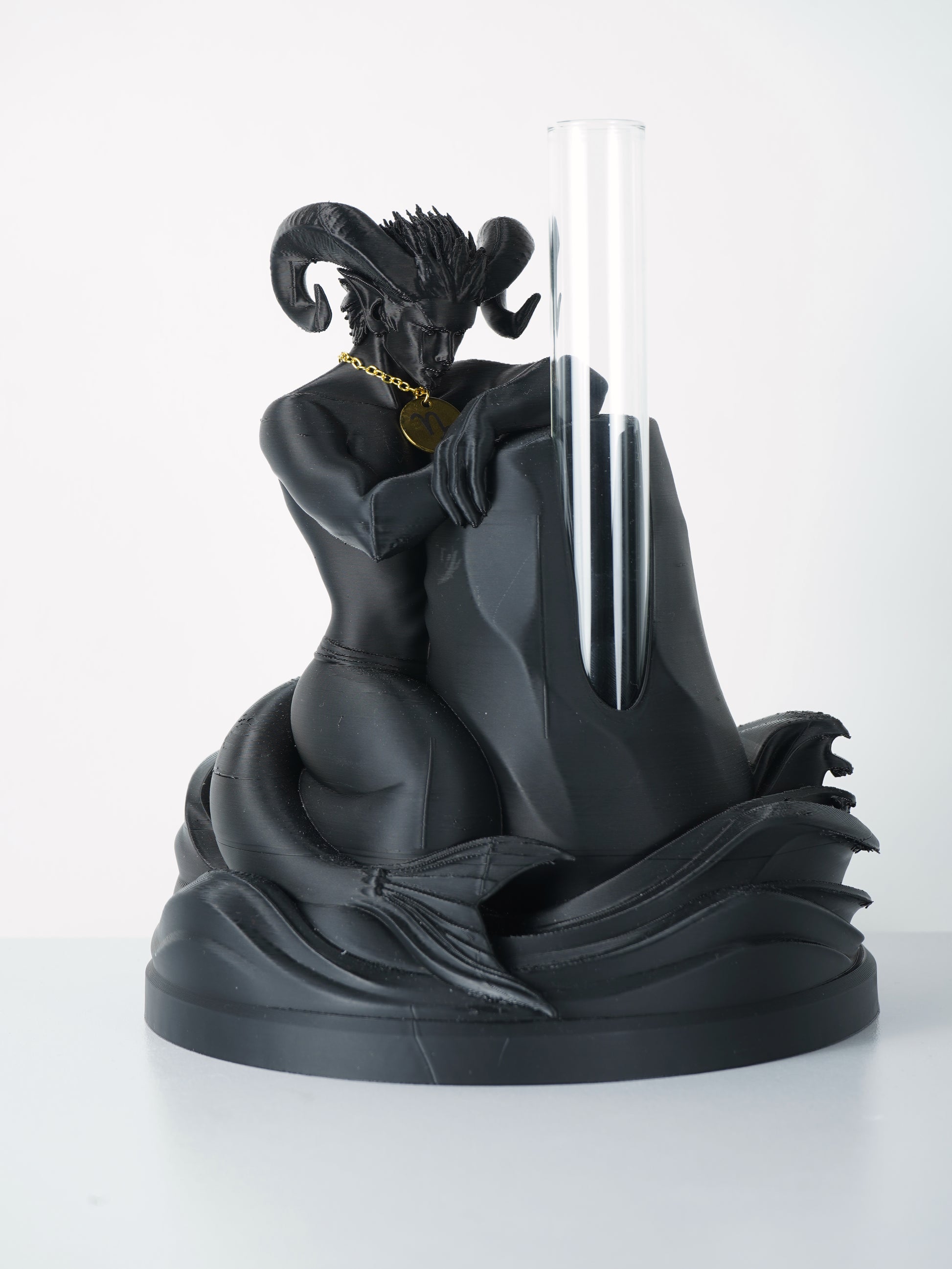 La figura è raffigurata con una postura stabile ed equilibrata, che richiama il carattere pratico e determinato del Capricorno. I dettagli scolpiti mettono in evidenza questa combinazione di solidità e fluidità, tipica di un segno che unisce razionalità e adattabilità.