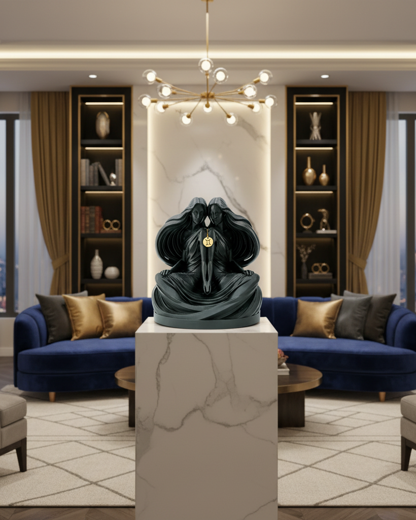 Le figure sono rappresentate in una posa dinamica e armoniosa, simbolo di una personalità versatile, brillante e sempre in movimento. I dettagli scolpiti richiamano la natura curiosa e mutevole dei Gemelli, un segno che ama comunicare, imparare e condividere idee, passando con naturalezza da un interesse all’altro.