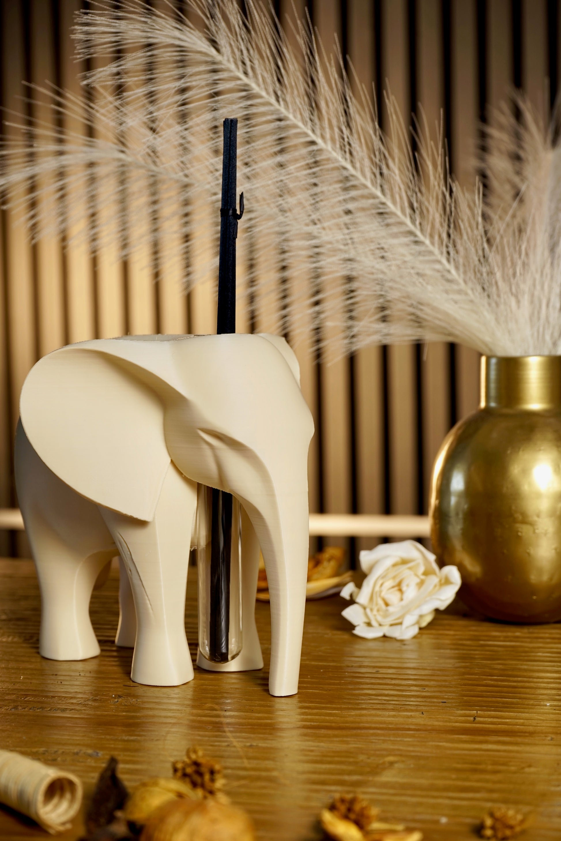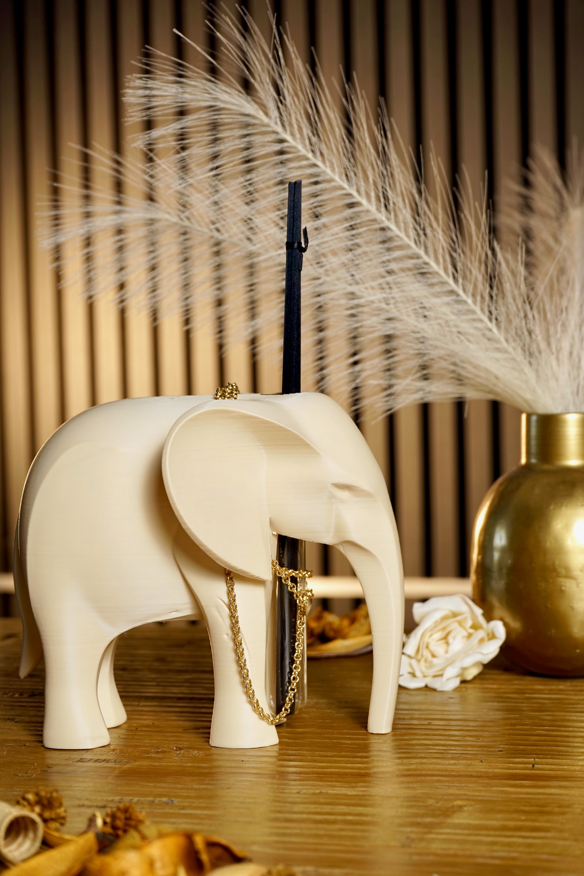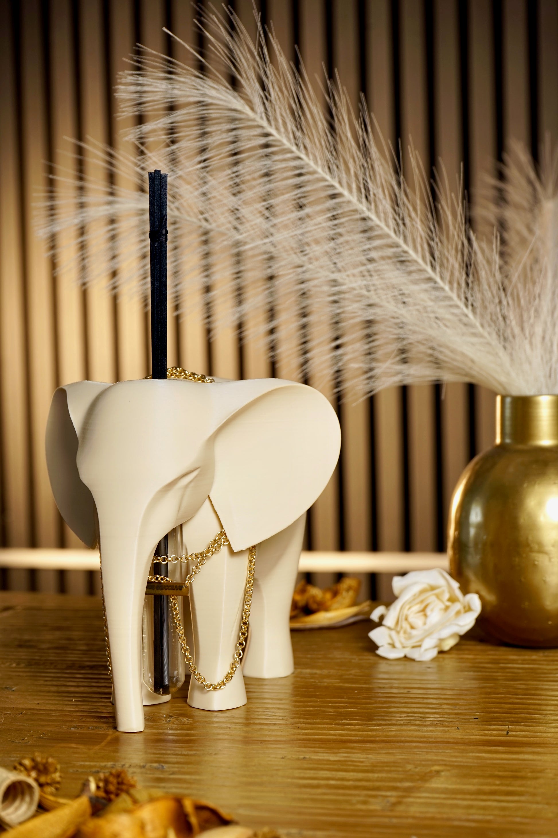 Questo raffinato diffusore, riprende la forma dell’elefante, simbolo universale di forza, saggezza e fortuna, reinterpretato in chiave moderna e decorativa. La catenella dorata con ciondolo inciso a laser (nome, data o frase) lo rende un pezzo unico, ideale come regalo speciale o come complemento d’arredo ricercato.