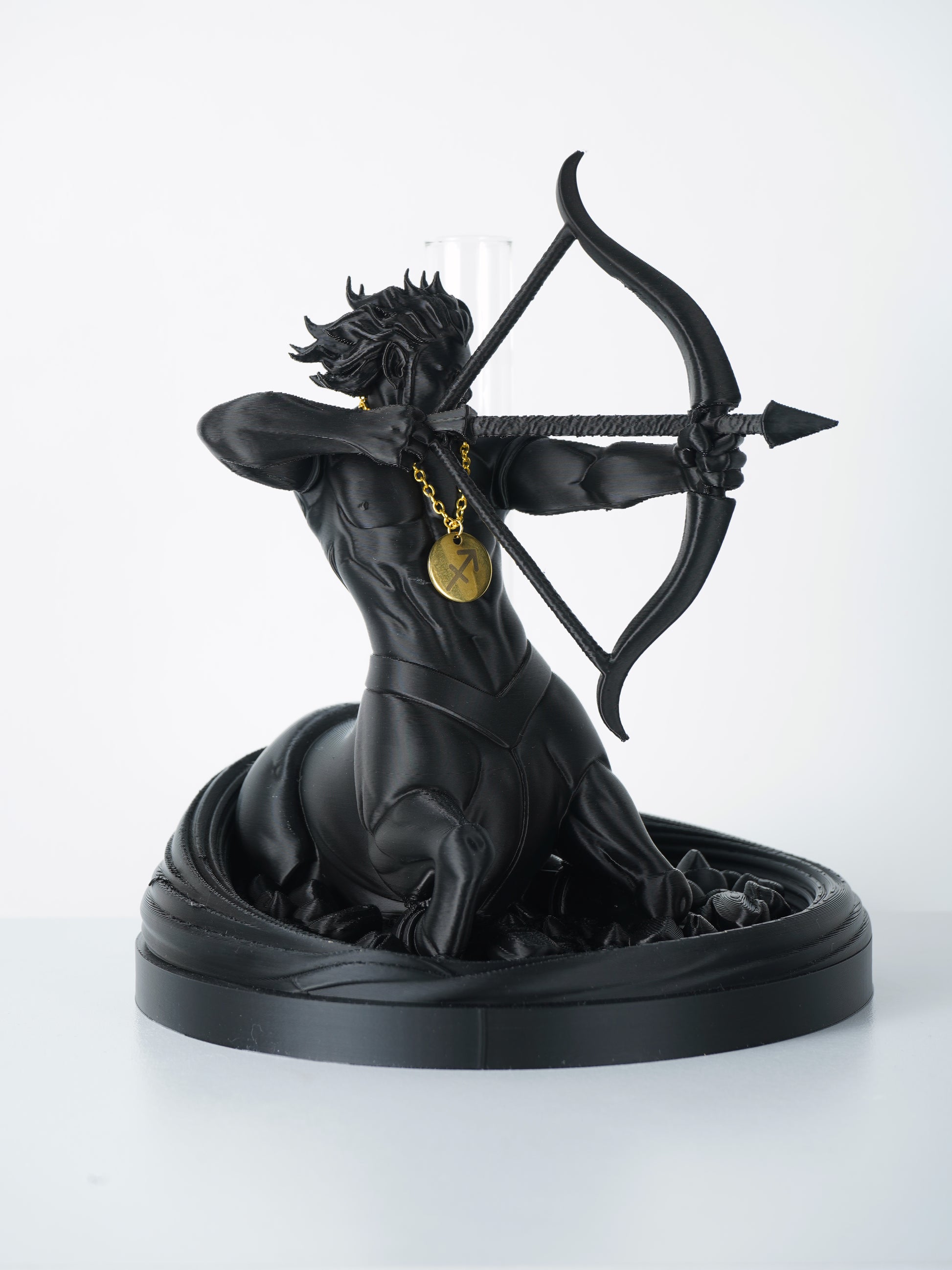 La figura è raffigurata con una postura aperta e dinamica, simbolo di una personalità curiosa, energica e sempre proiettata verso nuovi orizzonti. I dettagli scolpiti richiamano la natura idealista e sincera del Sagittario, un segno che ama viaggiare, conoscere e vivere la vita come un’avventura, guidato dall’entusiasmo e dalla voglia di scoprire.