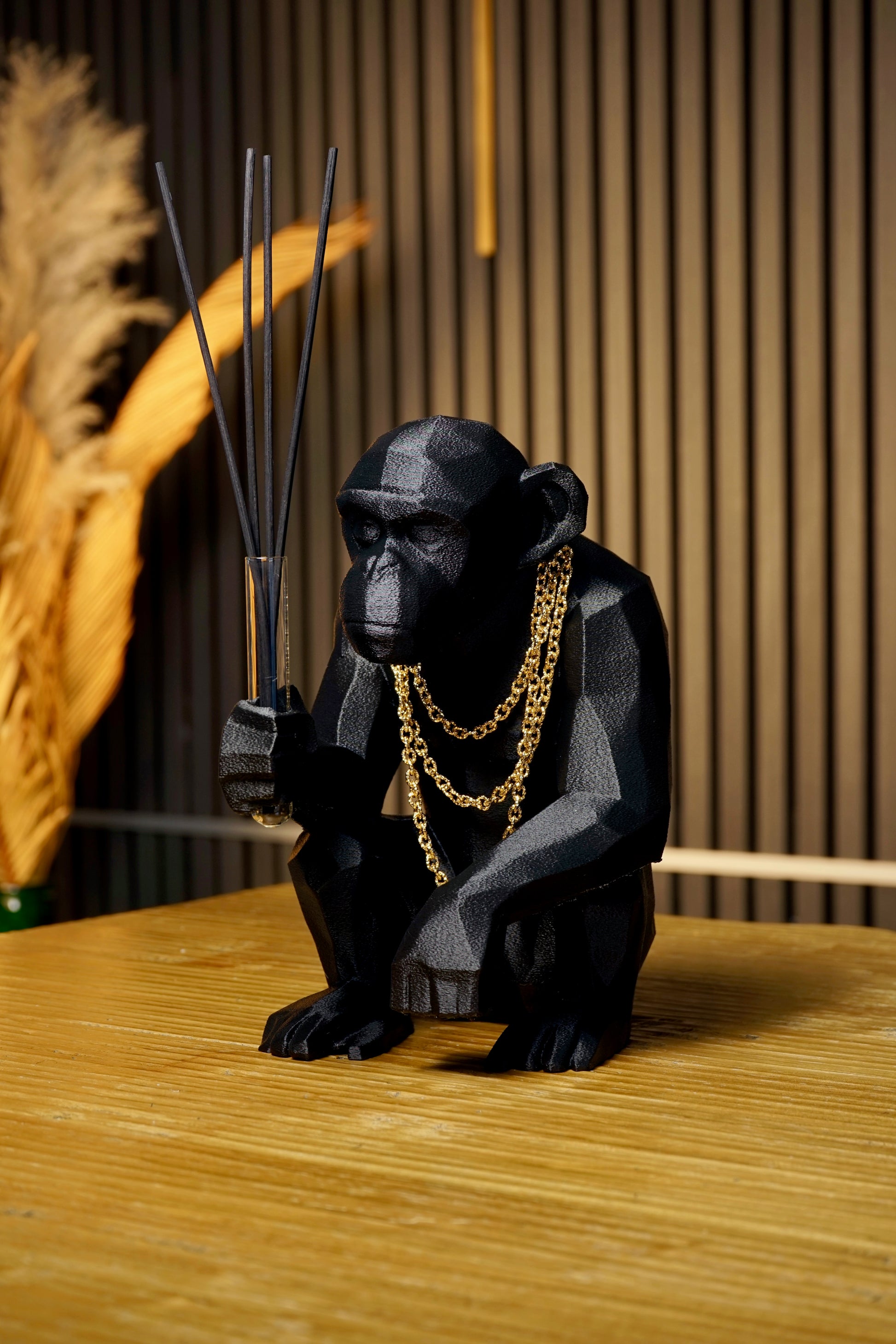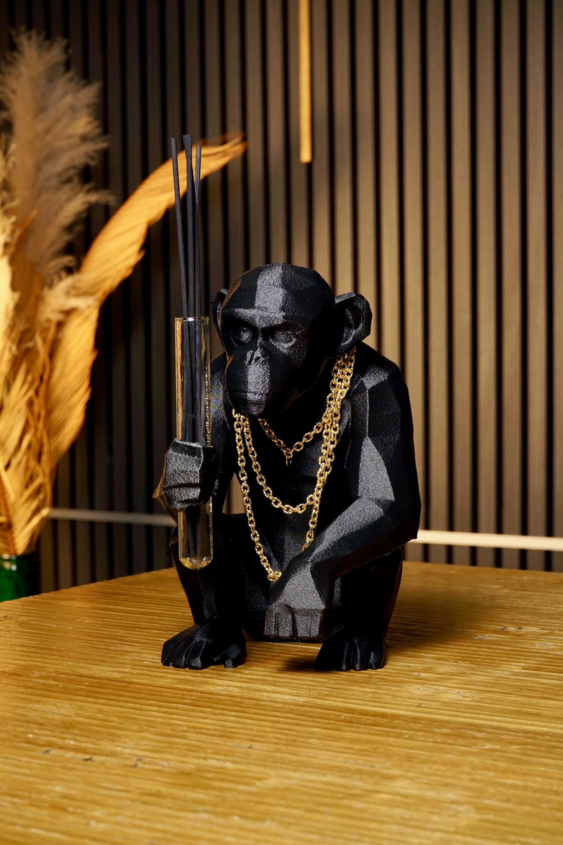 Questo imponente diffusore, alto oltre 25 cm, raffigura uno scimpanzé che sorregge con eleganza la provetta in vetro, rendendolo un vero protagonista dell’ambiente. La catenella dorata, impreziosita da un ciondolo inciso a laser con un nome, una data o una frase speciale, aggiunge un dettaglio esclusivo e personalizzato.